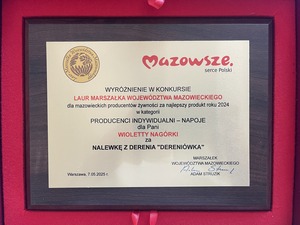 W dniu 7 maja br. w Warszawie, odbyło się uroczyste podsumowanie i wręczenie nagród XVIII Edycji Konkursu o Laur Marszałka. Kapituła Konkursu doceniła zgłoszoną przez LGD „ZIELONE SIOŁO” nalewkę z derenia „Dereniówkę” p. Woletty Nagórki z Ugniewa.